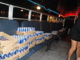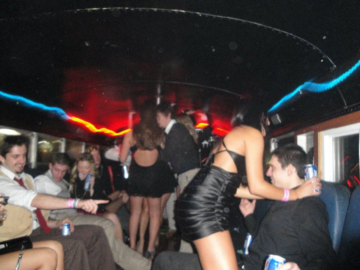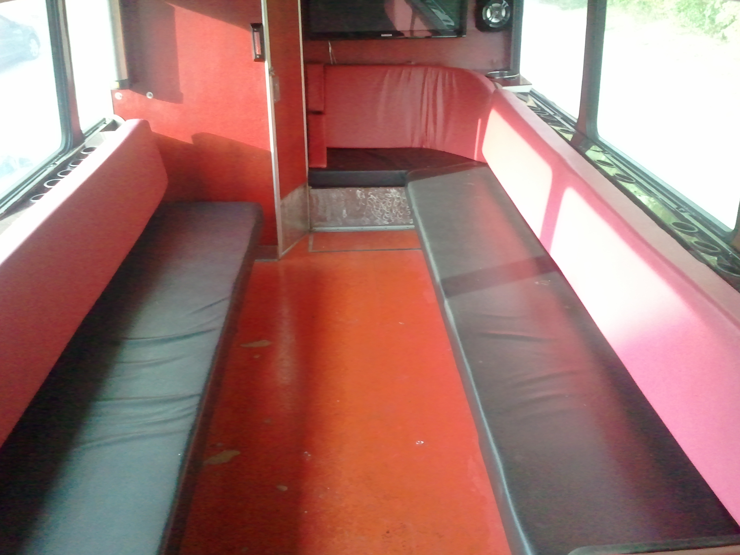 | This is the original party bus. We have a total of 6 of these party buses. We have 2 in Des Moines Iowa, 2 in the Quad Cities (Davenport,Bettendorf,Moline,Rock Island) and 2 in Iowa City. As you can see from photos to the left this is the bus to throw a real party on and make a big mess. Easy to clean and durable anything goes on these bad boys. Bring your A game with stripper poles on each of our buses plan on dancing the night away. Every bus has stripper poles, neon lighting, various types of flooring, limo style seating, CD player with Ipod hookups, 2 amplifiers subs and 4-8 6X9 speakers depending on what bus you choose. The party in the photos is of an Iowa City Fraternity Party. All the buses are virtually the same. Great for 21st Birthdays. Below are photos of the 6 buses available. |